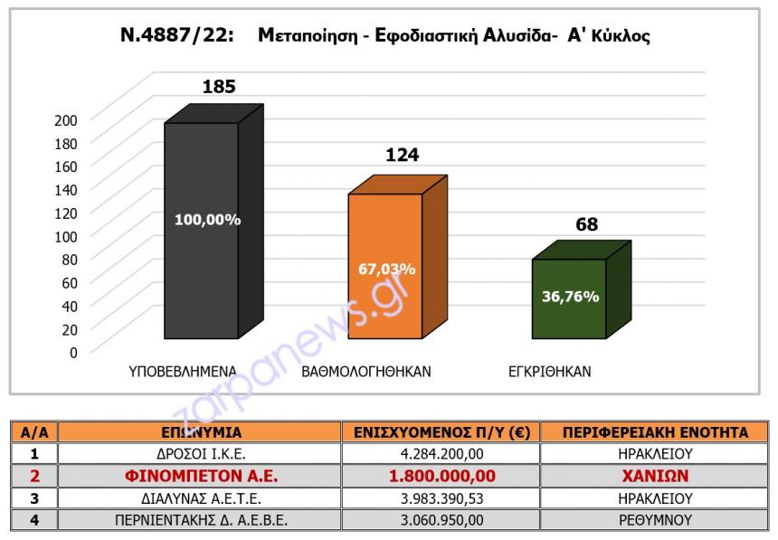 Στην ανάρτηση του Οριστικού Πίνακα Κατάταξης των εγκεκριμένων επενδυτικών σχεδίων που υποβλήθηκαν στον Α’ κύκλο του Καθεστώτος «Μεταποίηση – Εφοδιαστική Αλυσίδα» του Αναπτυξιακού Νόμου 4887/2022 προέβη χθες το Υπουργείο Ανάπτυξης, για τα επενδυτικά σχέδια με προϋπολογισμό άνω του € 1.000.000,00.
