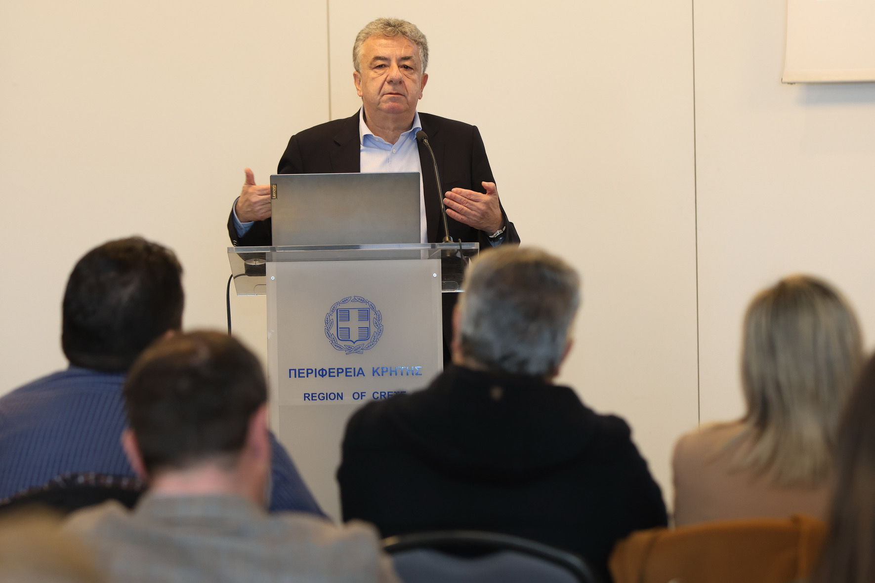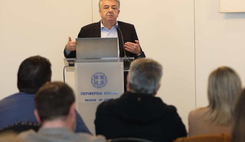 Ενημερωτική συνάντηση για τους νέους περιφερειακούς συμβούλους Κρήτης πραγματοποιείται σήμερα στο Ηράκλειο στο πλαίσιο της πρωτοβουλίας της Περιφέρειας Κρήτης για ολοκληρωμένη ενημέρωση των αιρετών σχετικά με την δομή, την λειτουργία και τον αναπτυξιακό σχεδιασμό της Περιφέρειας Κρήτης.