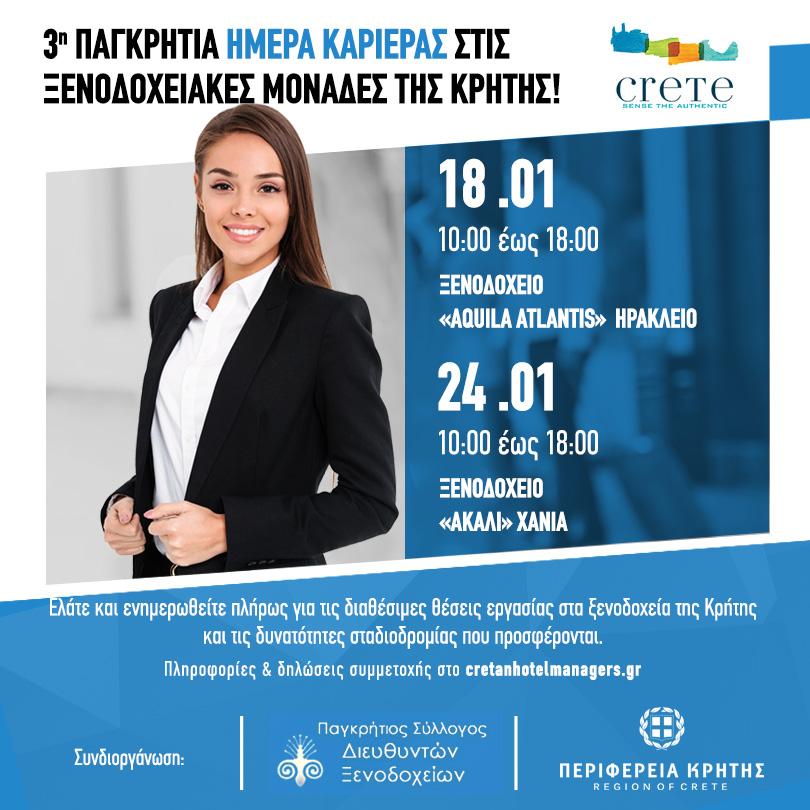 Ο Παγκρήτιος Σύλλογος Διευθυντών Ξενοδοχείων και η Περιφέρεια Κρήτης, αναγνωρίζοντας τη σημασία που έχει ο Τουρισμός στην Κρήτη, αλλά και οι μεγάλες δυνατότητες που προσφέρει ο ξενοδοχειακός κλάδος του νησιού μας στον τομέα της εργασίας, συνδιοργανώνουν την «3η Παγκρήτια ημέρα καριέρας στις Ξενοδοχειακές μονάδες της Κρήτης».