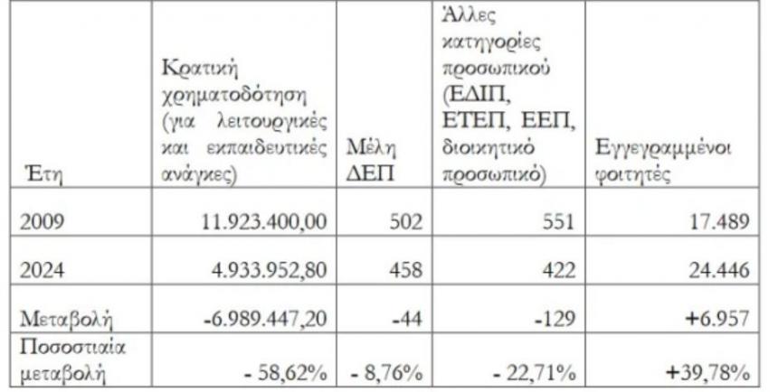 Σύμφωνα με τα στοιχεία αυτά η κρατική χρηματοδότηση για λειτουργικούς και εκπαιδευτικούς σκοπούς έχει περικοπεί κατά 58,62% σε σχέση με το 2009, τα μέλη ΔΕΠ έχουν μειωθεί κατά 8,76%, οι άλλες κατηγορίες προσωπικού (ΕΔΙΠ, ΕΤΕΠ, ΕΕΠ, διοικητικοί υπάλληλοι) κατά 22,71%, ενώ την ίδια περίοδο ο αριθμός των εγγεγραμμένων φοιτητών αυξήθηκε κατά 39,78%.