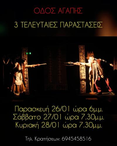 3 παραστάσεις απομένουν για την «Οδό Αγάπης» και τα διδακτικά της μηνύματα από τον Θεατρικό Περίπλου. Η οικογενειακή παράσταση ολοκληρώνει τον κύκλο της σηματοδοτώντας τα 36 χρόνια συστηματικής θεατρικής δράσης του θιάσου!