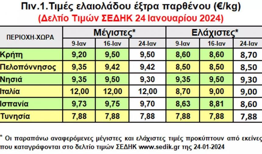 Το ράλι ανόδου για τις τιμές στο ελαιόλαδο συνεχίζεται. Δείτε στον παρακάτω πίνακα, τις τιμές όπως αποτυπώνονται στο δελτίο τιμών του ΣΕΔΗΚ: