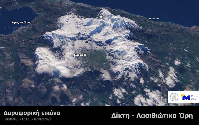Τα δεδομένα ανέλυσε και επεξεργάστηκε το meteo.gr/Ε.Α.Α σε τρισδιάστατη μορφή (3D), και παρουσιάζουν την εκτεταμένη χιονοκάλυψη στα βουνά της Κρήτης, στον Ψηλορείτη και στο όρος Δίκτη (ή Λασιθιώτικα Όρη).