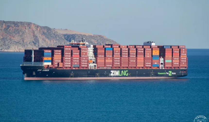 Το φορτηγό πλοίο ZIM AMBER σημαίας Χονγκ Κονγκ βρίσκεται εδώ και ένα 24ωρο αγκυροβολημένο στην είσοδο του κόλπου.