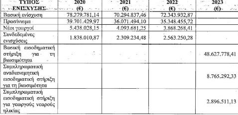 Η τεράστια διαφορά που προκύπτει, ούτε λίγο ούτε πολύ, έφθασε τα περίπου 53 εκ. ευρώ, σε σχέση με το 2023, καθώς πέρυσι το κονδύλι για τη Βασική εισοδηματική στήριξη ήταν στα 48.672.778 €, η Συμπληρωματική αναδιανεμητική έφτασε τα 8.765.292 ευρώ και η στήριξη για νέους αγρότες τα 2.896.511 ευρώ!