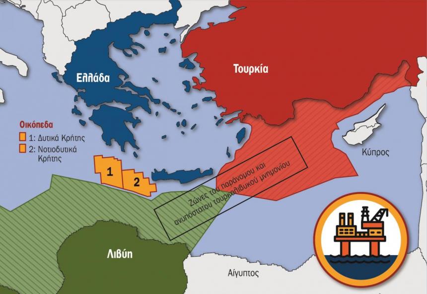 Στην περιοχή νότια και δυτικά της Κρήτης έχουν χαραχτεί και παραχωρηθεί στην κοινοπραξία ExxonMobil Helleniq Energy δύο blocks: η έκταση του block "Νοτιοδυτικά της Κρήτης" ανέρχεται σε 19.868 τετραγωνικά χιλιόμετρα, ενώ η έκταση του block "Δυτικά της Κρήτης" ανέρχεται σε 20.058 τετραγωνικά χιλιόμετρα.