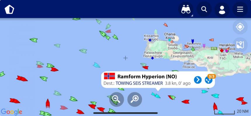 Ήδη σε θαλάσσια έκταση νοτιοδυτικά της Κρήτης πλέει το ειδικό σεισμογραφικό της εξειδικευμένης εταιρείας γεωφυσικών ερευνών PGS το RAMFORM HYPERION το οποίο εκτέλεσε τον Νοέμβριο του 2022 αντίστοιχες εργασίες πρόσκτησης τρισδιάστατων γεωφυσικών δεδομένων στα θαλάσσια blocksτης HELLENiQ ENERGY «Ιόνιο» και «10 – Κυπαρισσιακός».