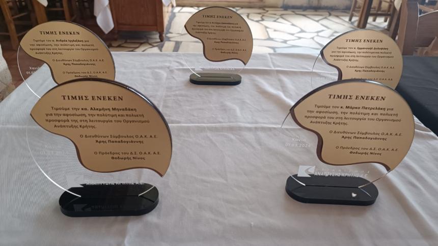 Στη διάρκεια της ζεστής εκδήλωσης που φιλοξενήθηκε σε γνωστό εστιατόριο του Αποκόρωνα, με πρωτοβουλία της διοίκησης του Οργανισμού Ανάπτυξης Κρήτης, απονεμήθηκαν αναμνηστικές πλακέτες σε πέντε [5] εργαζόμενους του Ο.Α.Κ., οι οποίοι συνταξιοδοτήθηκαν τα προηγούμενα χρόνια από τον «Οργανισμό», μετά από πολυετή προσφορά στον Ο.Α.Κ. και τις υπηρεσίες του.