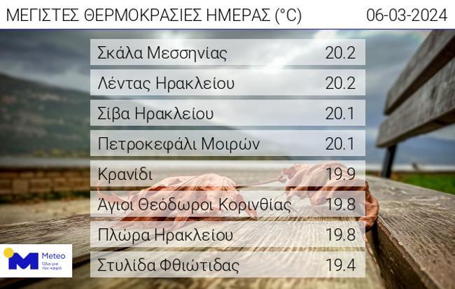 Πιο συγκεκριμένα σύμφωνα με το meteo.gr/Εθνικό Αστεροσκοπείο Αθηνών σε αρκετές περιοχές της χώρας ο υδράργυρος έφτασε στους 19-20 °C. Η υψηλότερη θερμοκρασία ανά την επικράτεια καταγράφηκε στον Λέντα και τη Σκάλα Μεσσηνίας.