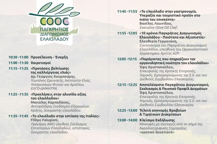11:55 - 12:05 «10 χρόνια Παγκρήτιος Διαγωνισμός Ελαιολάδου – Ποιότητα και Αξιοπιστία».