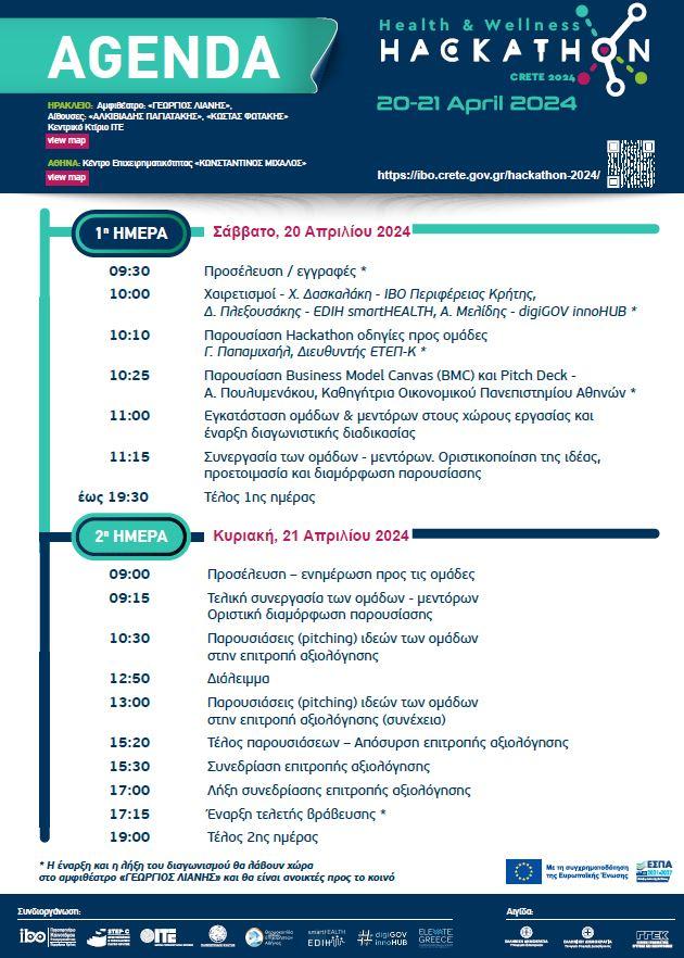 Τo πλήρες πρόγραμμα του διαγωνισμού μπορείτε να βρείτε στην ιστοσελίδα: https://ibo.crete.gov.gr/agenda-hackathon-for-health-and-wellness-crete-2024/