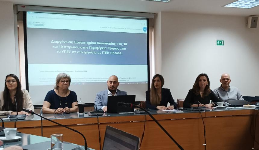 Το Παρατηρητήριο Καινοτόμου Επιχειρηματικότητας της Περιφέρειας Κρήτης συμμετείχε ενεργά στο διήμερο Εργαστήρι Καινοτομίας που διοργάνωσε το Τμήμα Καινοτομίας και Βέλτιστων Πρακτικών του Υπουργείου Εσωτερικών, σε συνεργασία με το Ινστιτούτο Τεκμηρίωσης, Έρευνας και Καινοτομιών (ΙΤΕΚ) του ΕΚΔΔΑ, στις 18 και 19 Απριλίου 2024, στο Επιμελητήριο Ηρακλείου.