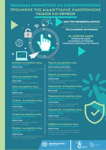 Από την πλευρά του ο κ. Νάκος ανέφερε ότι: «Η Διεύθυνση Δίωξης Ηλεκτρονικού Εγκλήματος έχει αναπτύξει μια συστηματική συνεργασία με την Περιφέρεια Κρήτης με σκοπό την ενημέρωση και την ευαισθητοποίηση παιδιών, εκπαιδευτικών και γονέων σε θέματα ασφαλούς διαδικτύου σε όλη την Κρήτη. Η Διεύθυνσή μας έχει δεχθεί στο τηλέφωνο 11188 του Κέντρου Διαχείρισης Διαδικτυακού Κινδύνου cyber alert, το οποίο λειτουργεί σε 24ωρη βάση, πάνω από 91.000 κλήσεις για το έτος 2023 και έχει διαχειρισθεί περισσότερες από 10.000 υποθέσεις. Όσον αφορά στην υλοποίηση ενημερωτικών δράσεων το 2023 δεχθήκαμε 830 αιτήματα σε όλη την Ελλάδα και πραγματοποιήσαμε 587 διαλέξεις δια ζώσης και εξ αποστάσεως. Αυτό που ζητάμε από τα παιδιά στα σχολεία είναι, ότι, όπως κάθε τι που τους συμβαίνει στην πραγματική τους ζωή θα πρέπει να το πουν και όχι να το υποστούν, το ίδιο ακριβώς θα πρέπει να κάνουν και για τη διαδικτυακή τους ζωή. Εμείς είμαστε δίπλα τους για να διαφυλάξουμε την υγεία τους και το ίδιο τους το μέλλον».