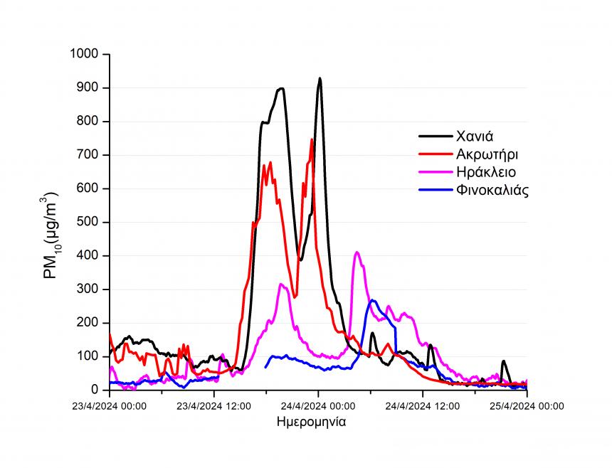 Το διάστημα 22-24/04/2024 η Περιφέρεια Κρήτης επηρεάστηκε έντονα από επεισόδιο μεταφοράς σκόνης από την έρημο της Σαχάρας. Η εξέλιξη του φαινομένου καταγράφηκε σε πραγματικό χρόνο από τους τέσσερις εγκατεστημένους σταθμούς του Δικτύου ΣΧΕΔΙΑ Κρήτης (Σχέδιο δράσης αντιμετώπισης της ατμοσφαιρικής ρύπανσης για την Περιφέρεια Κρήτης) στους οποίους πραγματοποιούνται, μεταξύ άλλων ατμοσφαιρικών ρύπων, μετρήσεις σωματιδιακού φορτίου PM10, στην πόλη των Χανίων, στο Ακρωτήρι Χανιών, στην πόλη του Ηρακλείου και στο Φινοκαλιά Λασιθίου. Το νέφος της σκόνης επηρέασε αρχικά το δυτικό μέρος του νησιού και κινούμενο ανατολικά επηρέασε σταδιακά όλο το νησί με σαφώς μειωμένη ένταση. Οι μέγιστες συγκεντρώσεις σκόνης παρατηρηθήκαν στην πόλη των Χανιών, με μέγιστη στιγμιαία συγκέντρωση τα 928 μg/m3. Αντίστοιχα, στο σταθμό Ακρωτηρίου η μέγιστη συγκέντρωση μετρήθηκε στα 746 μg/m3, στο Ηράκλειο 410 μg/m3 και στο Φινοκαλιά 268 μg/m3. Η οριακή τιμή για την ανθρώπινη υγεία βάσει της ισχύουσας νομοθεσίας είναι τα 50 μg/m3 (μέση τιμή εικοσιτετράωρου), και φυσικά παρατηρήθηκε υπέρβαση σε όλη την Κρήτη στις 23 και 24 Απριλίου.