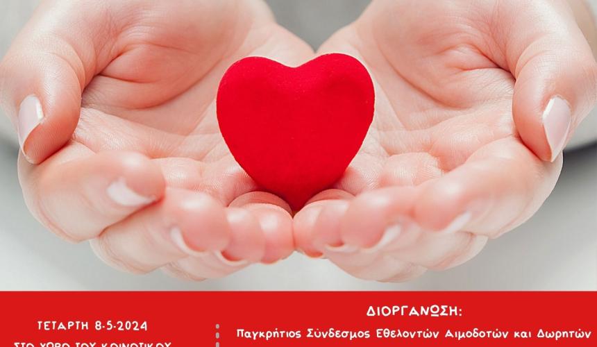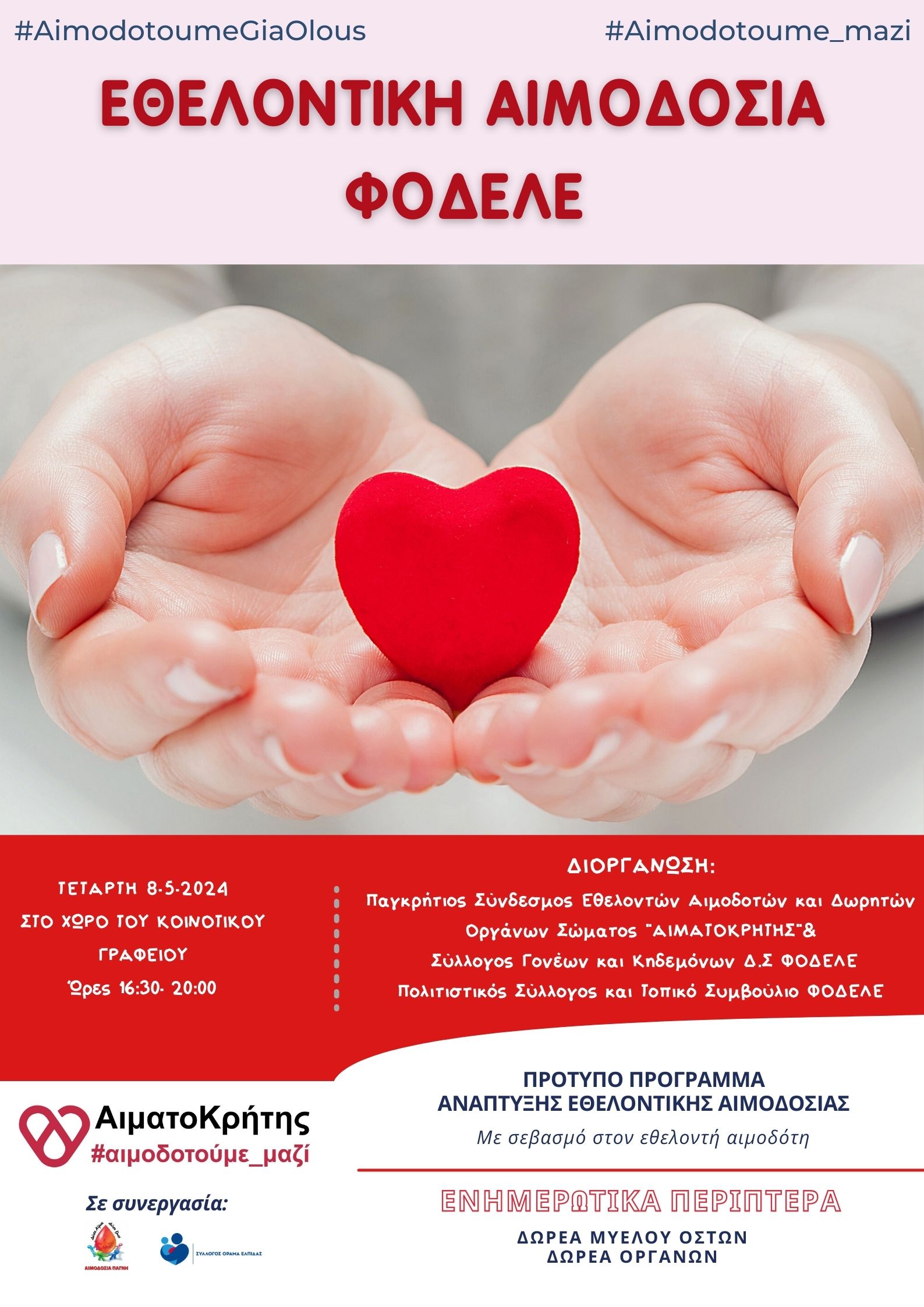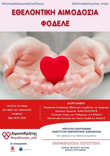 Εθελοντική Αιμοδοσία θα πραγματοποιηθεί την Τετάρτη 8/5/2024 στον χώρο του κοινοτικού γραφείου Φόδελε και ώρες 16:30 – 20:00. Την αιμοδοσία διοργανώνει ο Παγκρήτιος Σύνδεσμος Εθελοντών Αιμοδοτών και Δωρητών Οργάνων Σώματος «Αιματοκρήτης» σε συνεργασία με το Σύλλογο Γονέων και Κηδεμόνων, τον Πολιτιστικό Σύλλογο και το Τοπικό Συμβούλιο Φόδελε. Οι αιμοληψίες θα πραγματοποιηθούν από την κινητή μονάδα αιμοδοσιών του ΠΑΓΝΗ.