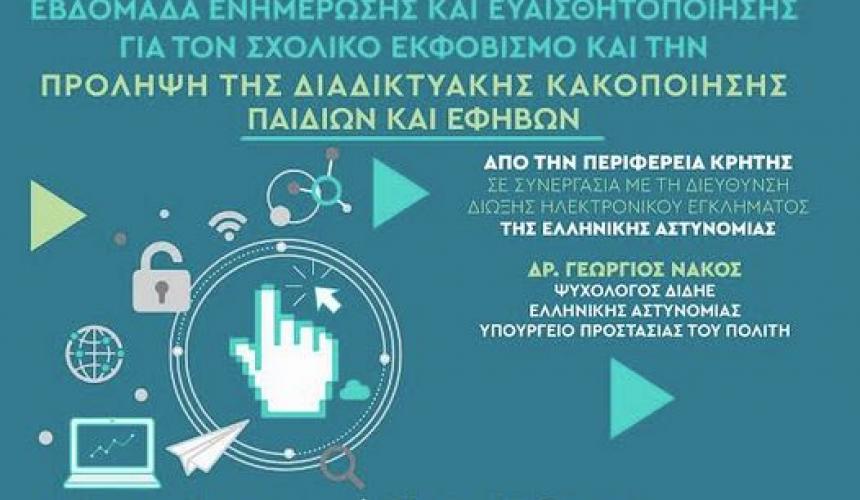 Η Περιφέρεια Κρήτης, Αυτοτελές Γραφείο Ισότητας, στο πλαίσιο του «Περιφερειακού Σχεδίου Δράσης Κρήτης για την Ισότητα των Φύλων 2023-2025», συνεχίζουν τη συνεργασία τους με τη Διεύθυνση Δίωξης Ηλεκτρονικού Εγκλήματος της Ελληνικής Αστυνομίας, πραγματοποιώντας τον τρίτο και τελευταίο, για το σχολικό έτος 2023-2024, κύκλο ενημερωτικών δράσεων για την ασφαλή πλοήγηση στο διαδίκτυο, τους διαδικτυακούς κινδύνους και τις πρακτικές αντιμετώπισής τους από τη Δευτέρα 13 Μαΐου έως και την Κυριακή 19 Μαΐου 2024.