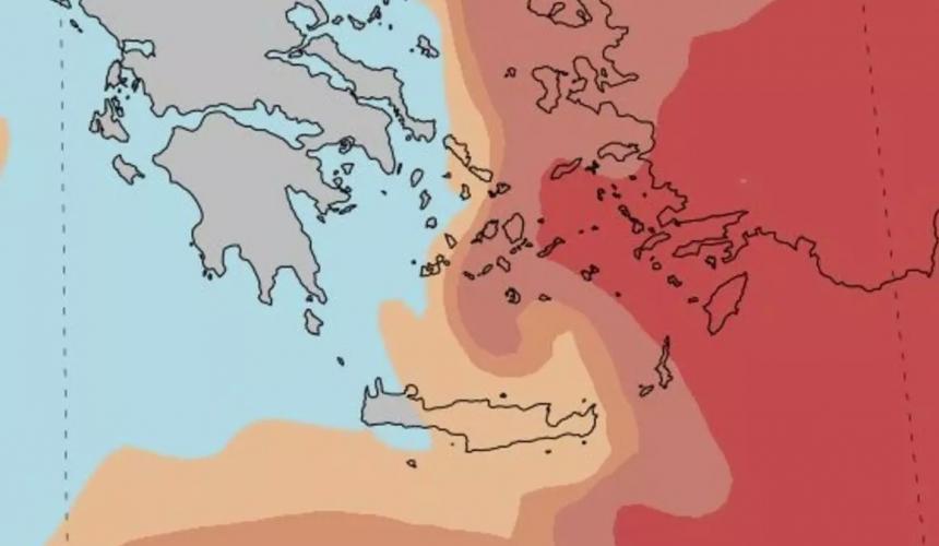 Ο χάρτης που παρουσιάζει ο Διευθυντής Ερευνών του meteo.gr, γνωστός μετεωρολόγος, Κώστας Λαγουβάρδος, αποτυπώνει την πρόγνωση μεταφοράς ερημικής σκόνης για την Τετάρτη το βράδυ.