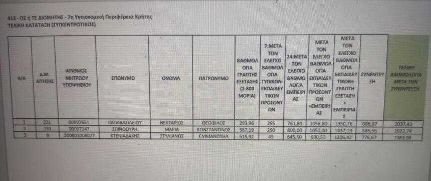 «Το Ανώτατο Συμβούλιο Επιλογής Προσωπικού (Α.Σ.Ε.Π.) γνωστοποιεί ότι, στο πλαίσιο της Α.Π: Γ4β/Γ.Π.οικ.69377/29.12.2023 (1ΥΠΕΑΡΧΩΝ/2023, ΑΔΑ: 9ΝΞ5465ΦΥΟ-ΣΡ3) Πρόσκλησης Εκδήλωσης Ενδιαφέροντος, η αρμόδια Επιτροπή Επιλογής Στελεχών ολοκλήρωσε τις συνεντεύξεις και κατάρτισε τον πίνακα των τριών (3) επικρατέστερων υποψηφίων για τη μία (1) θέση Διοικητή ανά Υγειονομική Περιφέρεια (ΥΠΕ). Συνολικά προκηρύχθηκαν επτά (7) θέσεις Διοικητών για επτά (7) ΥΠΕ, κατά τα οριζόμενα στις διατάξεις της παραγράφου 7θ του άρθρου 4 του νόμου 5062/2023.