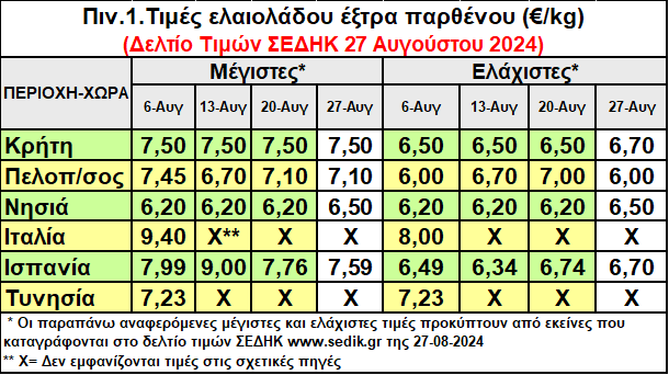 Μια συνοπτική εικόνα των μέγιστων και ελάχιστων τιμών για το έξτρα παρθένο ελαιόλαδο, στην Ελλάδα, Ιταλία και Ισπανία, όπως προκύπτει από τα στοιχεία του αναλυτικού Δελτίου τιμών του ΣΕΔΗΚ της 27-8-2024, παρουσιάζεται στον Πίνακα 1 που ακολουθεί: