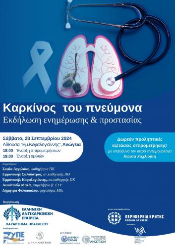 Εκδήλωση οργανώνει το Παράρτημα Ηρακλείου της Ελληνικής Αντικαρκινικής Εταιρείας το Σάββατο 28 Σεπτεμβρίου στα Ανώγεια με αντικείμενο τον καρκίνο του πνεύμονα.
