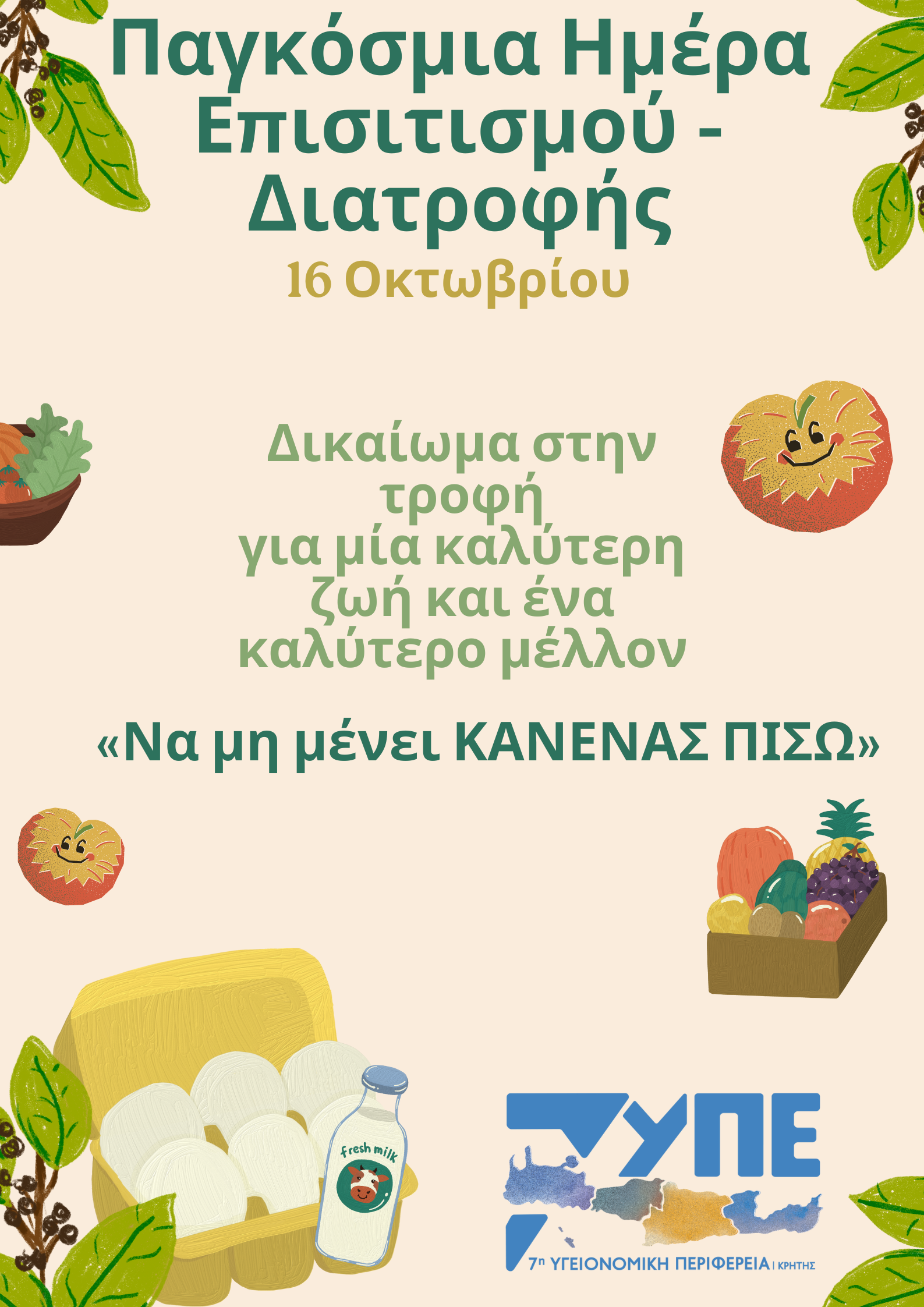 Η Παγκόσμια Ημέρα Διατροφής και Επισιτισμού (World Food Day) εορτάζεται κάθε χρόνο στις 16 Οκτωβρίου και στοχεύει στην παγκόσμια ευαισθητοποίηση και σε μια συλλογική ανάληψη δράσης για την εξασφάλιση της διαθεσιμότητας αρκετών θρεπτικών και ασφαλών τροφίμων, σε προσιτή τιμή, για τον οποιονδήποτε, προκειμένου να διασφαλιστεί ότι δεν θα μείνει κανείς πίσω.