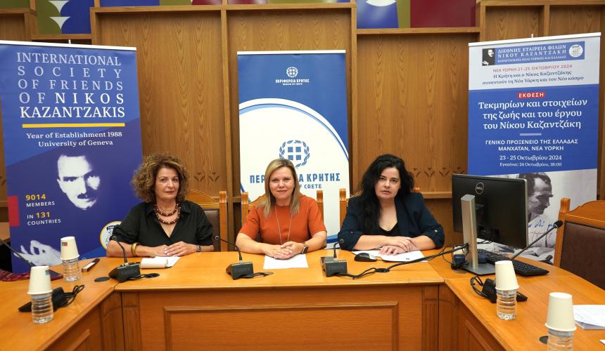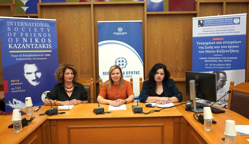 Οι σπουδαίες εκδηλώσεις με τίτλο «Η Κρήτη και ο Νίκος Καζαντζάκης συναντούν τη Νέα Υόρκη και τον Νέο Κόσμο» που πρόκειται να πραγματοποιηθούν στη Νέα Υόρκη, από 21 έως 25 Οκτωβρίου 2024, με την υποστήριξη της Περιφέρειας Κρήτης, τη Διεθνή Εταιρεία Φίλων Νίκου Καζαντζάκη (ΔΕΦΝΚ)-Παραρτήματα Νέας Υόρκης και Ελλάδας και το Μουσείο Νίκος Καζαντζάκης, παρουσιάστηκαν σήμερα στη Περιφέρεια Κρήτης στο πλαίσιο συνέντευξης τύπου από την Αντιπεριφερειάρχη Πολιτισμού και Ισότητας Γωγώ Μηλάκη, τη διευθύντρια του Μουσείου Νίκου Καζαντζάκη Μαριλένα Μηλαθιανάκη και το μέλος του δ.σ. της ΔΕΦΝΚ Μαρία Ζαχαριάκη.