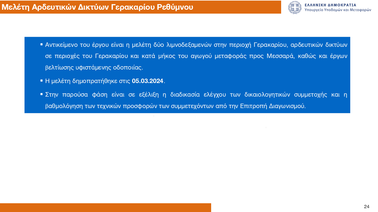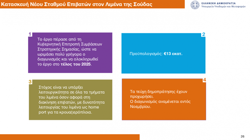 - Κατασκευή Νέου Σταθμού Επιβατών στον Λιμένα της Σούδας.