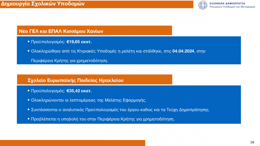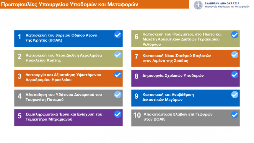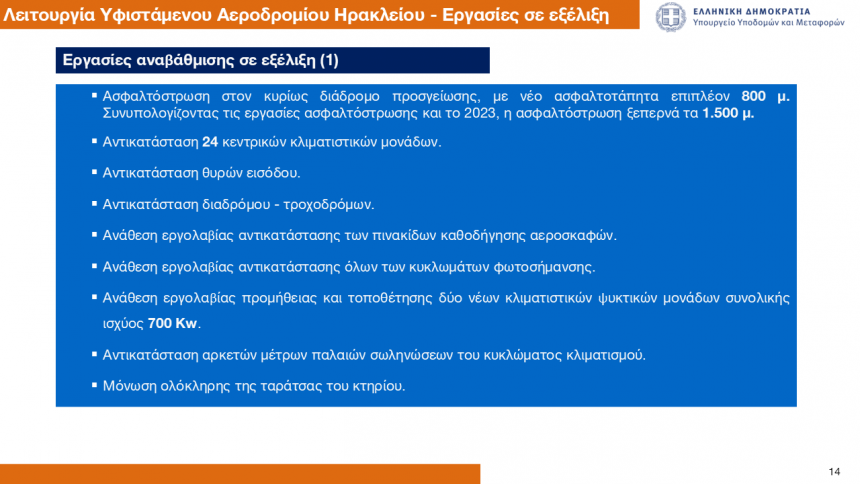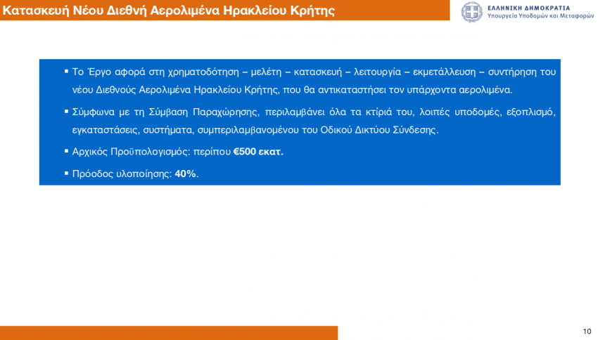 - Κατασκευή του Νέου Διεθνή Αερολιμένα Ηρακλείου Κρήτης στο Καστέλλι.