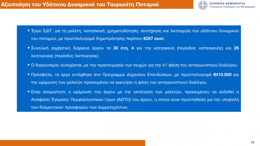 - Αξιοποίηση του Yδάτινου Δυναμικού του Ταυρωνίτη Ποταμού.