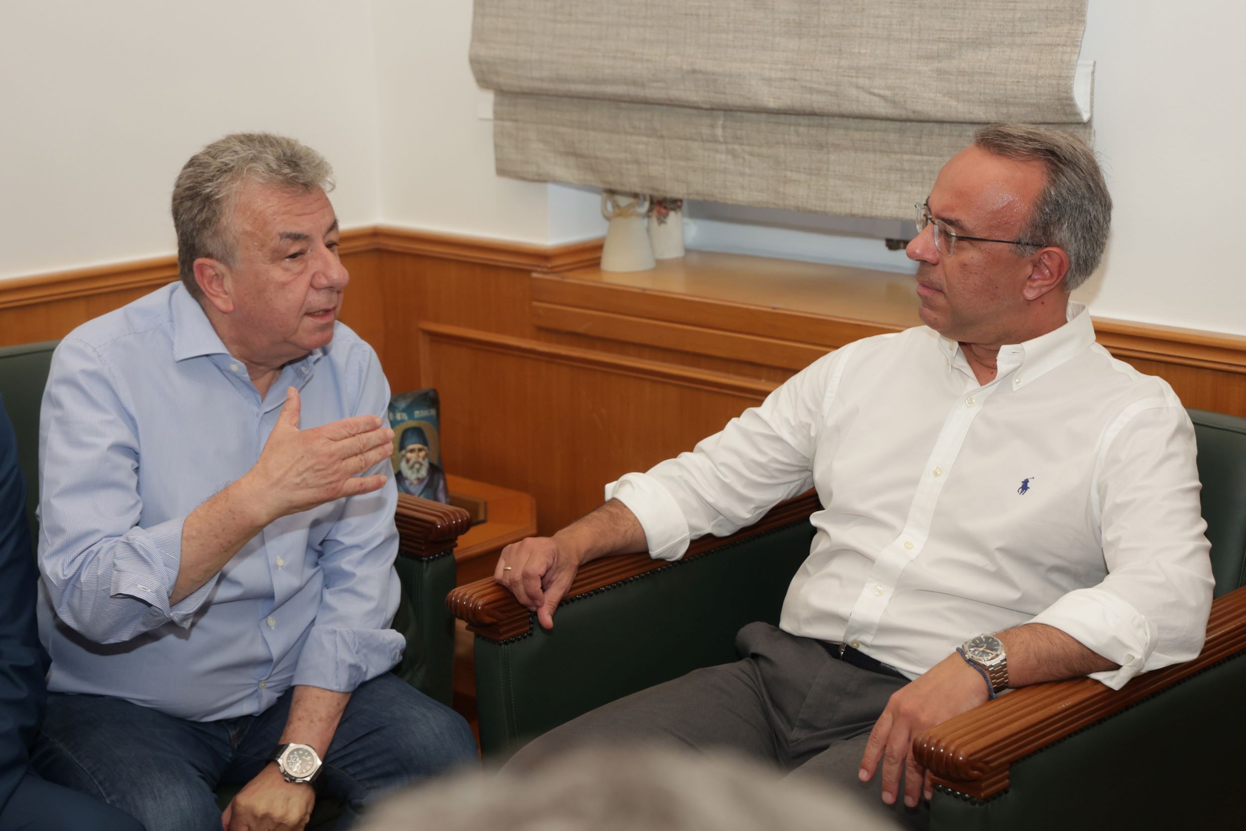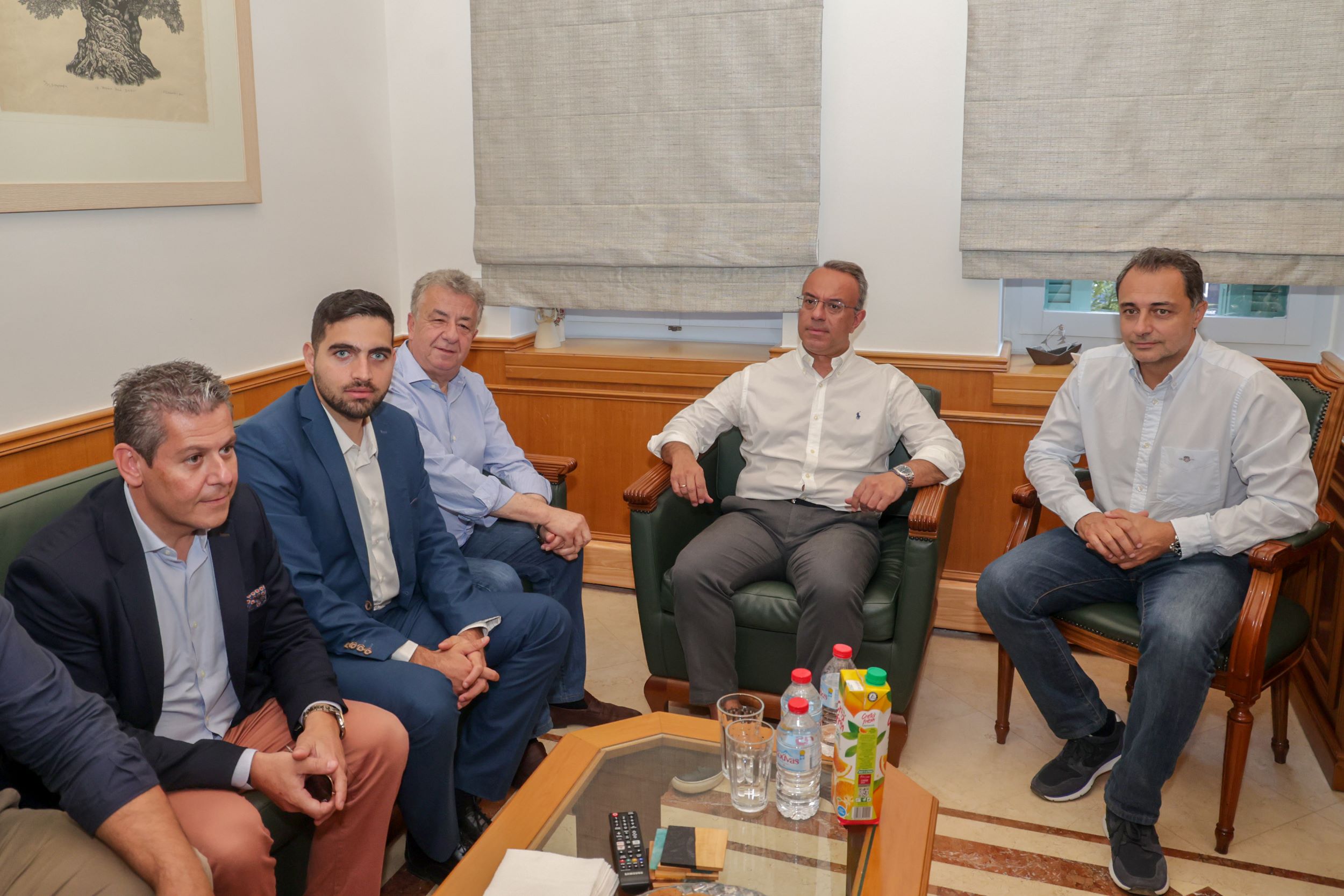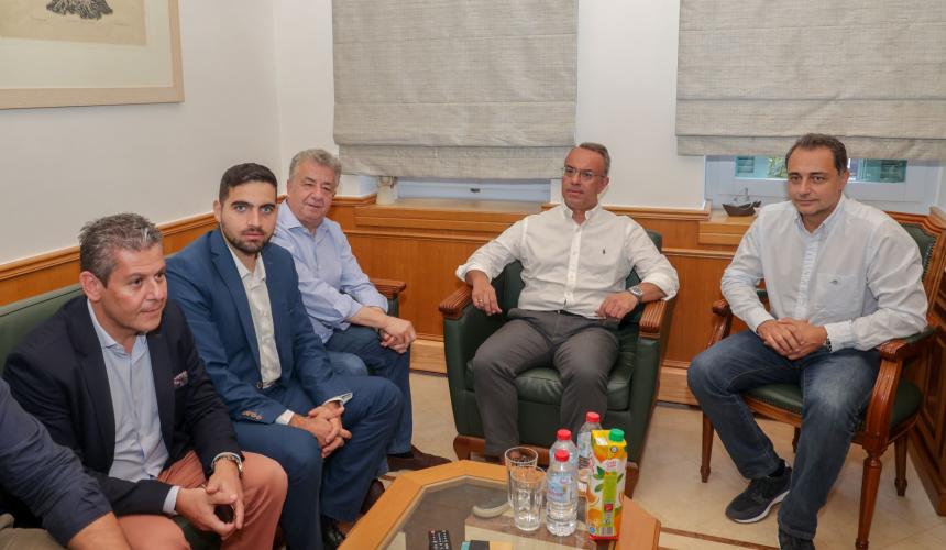 Τον Υπουργό Υποδομών Χρήστο Σταϊκούρα υποδέχθηκε σήμερα το μεσημέρι στην Περιφέρεια Κρήτης ο Περιφερειάρχης Σταύρος Αρναουτάκης, στο πλαίσιο της παρουσίας του Υπουργού στο νησί.