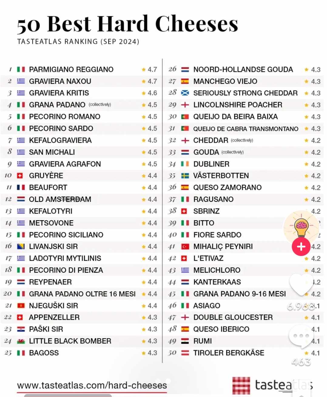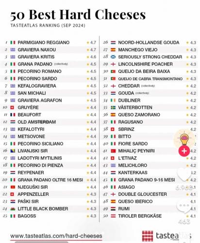 Πιο συγκεκριμένα, στη 2η θέση βρίσκεται η γραβιέρα Νάξου και στην 3η η γραβιέρα Κρήτης. Λίγο πιο κάτω, στην 7η θέση βρίσκεται η κεφαλογραβιέρα, στην 8η το Σαν Μιχάλη (από τη Σύρο), στην 9η η γραβιέρα Αγράφων, στην 13η το κεφαλοτύρι, στην 14η το μετσοβόνε και στην 17η το λαδοτύρι Μυτιλήνης ενώ τέλος στην 43η θέση βρίσκεται το Μελίχλωρο (από τη Λήμνο).