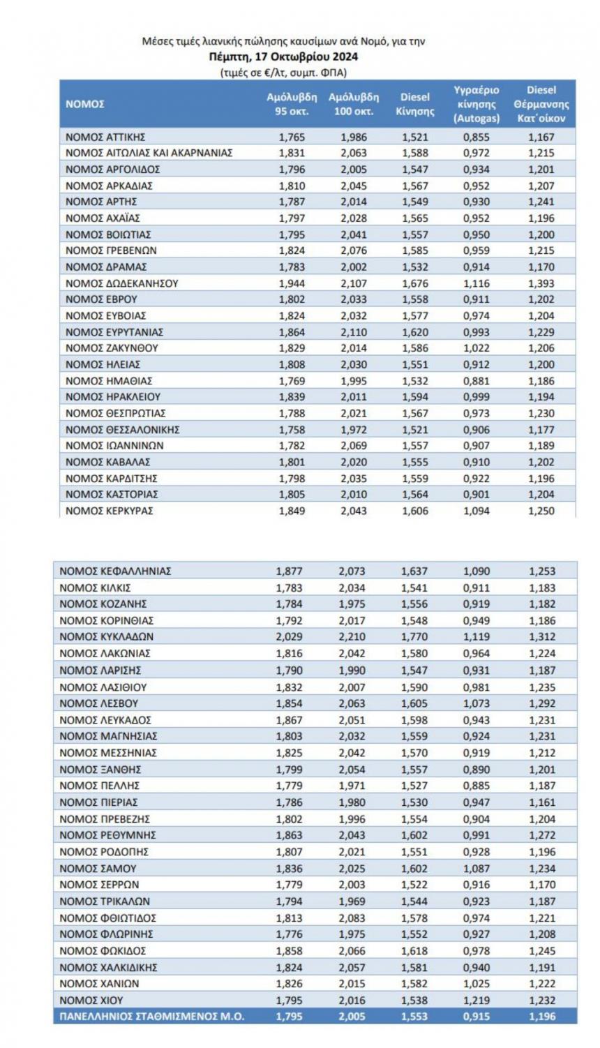 Στην Αττική η μέση τιμή για το πετρέλαιο θέρμανσης η διάθεση του οποίου ξεκίνησε στις 15 Οκτωβρίου διαμορφώνεται σε 1,167 ευρώ το λίτρο, ενώ στη Θεσσαλονίκη σε 1,177 ευρώ το λίτρο. Πάνω από 1,2 ευρώ το λίτρο πωλείται σε πολλούς νομούς της χώρας, ενδεικτικά στο 1,250 αποτυπώνεται η μέση τιμή στον Νομό Κερκύρας, στο 1,241 στον Νομό Αρτας. Στους τέσσερις νομούς της Κρήτης το πετρέλαιο πωλείται από 1,194 μέχρι 1,272. Πρώτος ακριβότερος νομός πάντως εμφανίζεται η Λέσβος με 1,292 ευρώ το λίτρο.