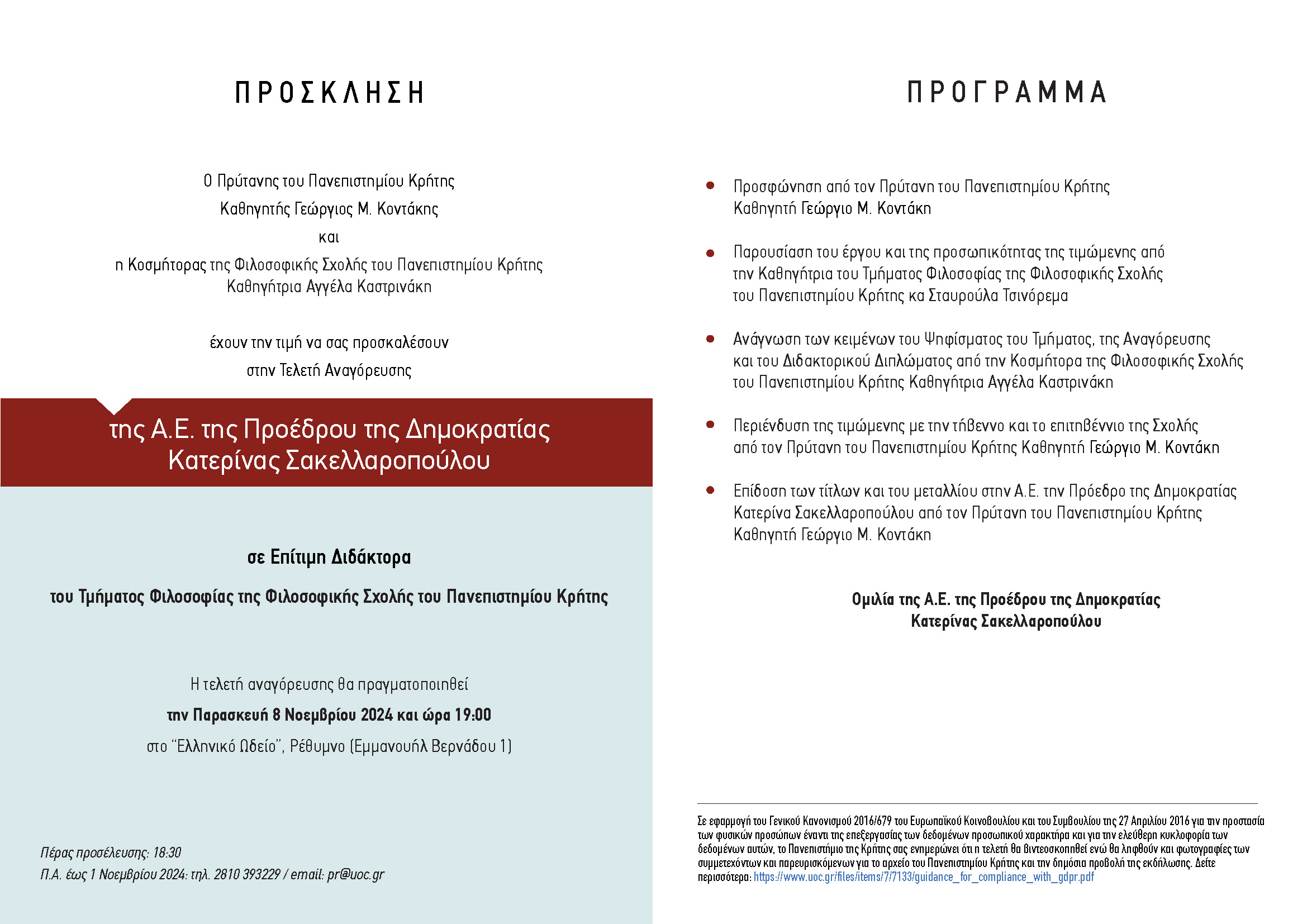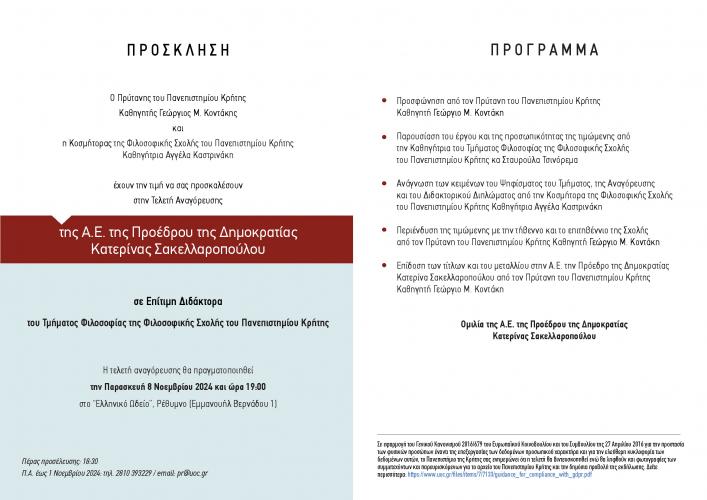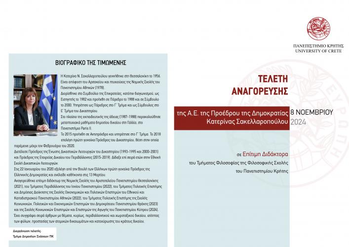 Η Α.Ε. Πρόεδρος της Δημοκρατίας Κατερίνα Σακελλαροπούλου θα αναγορευτεί Επίτιμη Διδάκτορας του Τμήματος Φιλοσοφίας της Φιλοσοφικής Σχολής του Πανεπιστημίου Κρήτης.