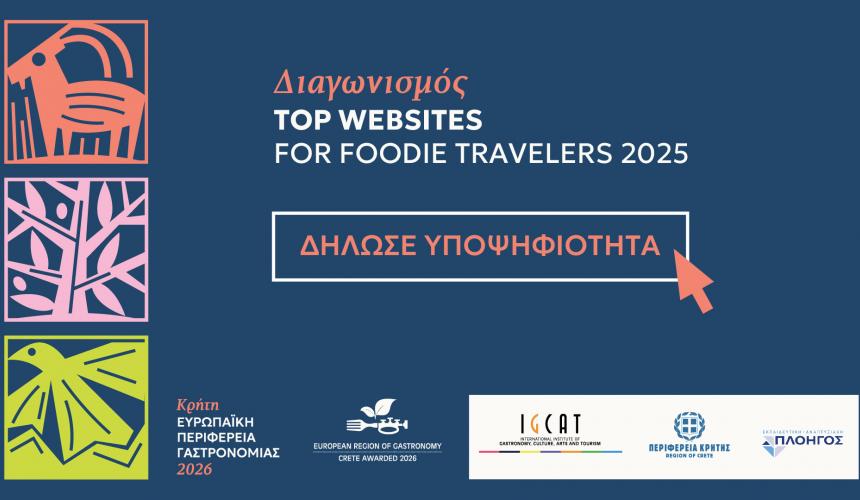Στο πλαίσιο της συμμετοχής της Κρήτης ως Ευρωπαϊκή Περιφέρεια Γαστρονομίας 2026, στον διαγωνισμό “TOP WEBSITES FOR FOODIE TRAVELERS 2025” που διοργανώνεται από το Διεθνές Ινστιτούτο Γαστρονομίας, Πολιτισμού, Τεχνών και Τουρισμού (IGCAT), η Περιφέρεια Κρήτης απευθύνει πρόσκληση σε δημόσιους και ιδιωτικούς φορείς να υποβάλουν υποψηφιότητα με σκοπό τη βράβευση των ιστοσελίδων (websites) τους που πρέπει απαραιτήτως να σχετίζονται με τον γαστρονομικό πολιτισμό της Κρήτης.