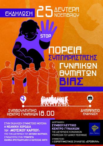 Με προσήλωση στον στόχο της καταπολέμησης των φαινομένων έμφυλης βίας, το Κέντρο Συμβουλευτικής Υποστήριξης Γυναικών Θυμάτων Βίας της Διεύθυνσης Κοινωνικών Υπηρεσιών Δ.Ρ. συμμετέχει, όπως κάθε χρόνο, στον εορτασμό της Παγκόσμιας Ημέρας Εξάλειψης της Βίας κατά των Γυναικών, ο οποίος έχει καθιερωθεί στις 25 Νοεμβρίου κάθε έτους.