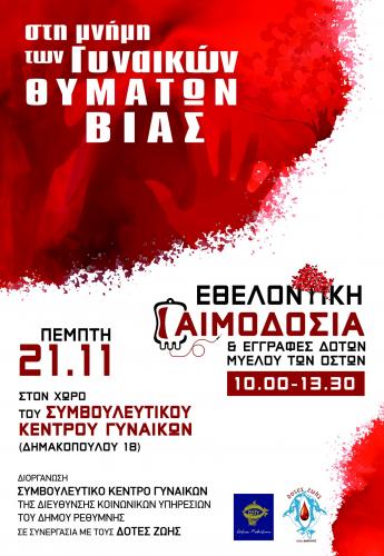 - Την Πέμπτη 21 Νοεμβρίου 2024, θα πραγματοποιηθεί Εθελοντική Αιμοδοσία στη μνήμη των Γυναικών θυμάτων Βίας και εγγραφές Δοτών Μυελού των Οστών, σε συνεργασία με το Σύλλογο Εθελοντών Αιμοδοτών Ν. Ρεθύμνου «Δότες Ζωής».