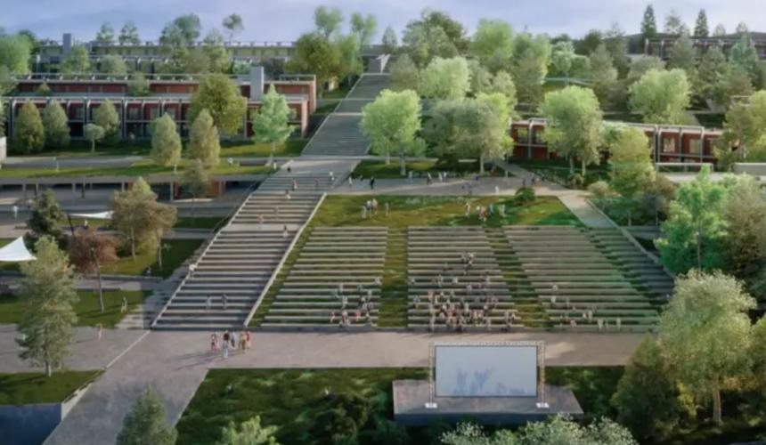 α. Μέρος της Κεντρικής Πλατείας στην Πανεπιστημιούπολη Ρεθύμνου, όπου περιλαμβάνονται Γραφεία Διοίκησης, Εμπορικό Κέντρο, βιοκλιματικά σκέπαστρα, υπαίθριος χώρος προβολών και αμφιθεατρική διάταξη κτηρίων,