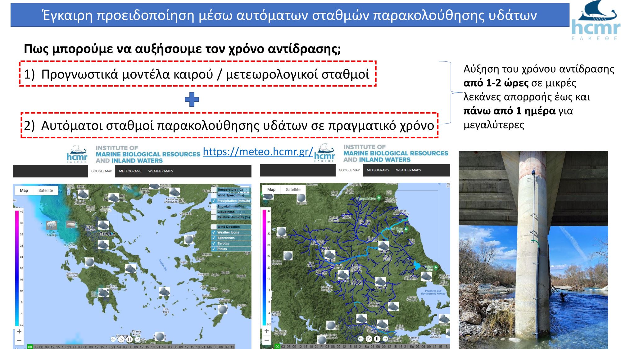 Τον τρόπο λειτουργίας του δικτύου παρουσίασαν οι ερευνητές Ηλίας Δημητρίου και Αναστάσιος Παπαδόπουλος. Όπως εξήγησαν ήδη λειτουργούν 90 σταθμοί σε διάφορες περιοχές της χώρας, παρέχοντας πληροφορίες σε πραγματικό χρόνο για κρίσιμες παραμέτρους, όπως τη στάθμη των υδάτων, την ξηρασία, ακόμη και ενδεχόμενη ρύπανση. Παράλληλα το δίκτυο έχει τη δυνατότητα να αξιοποιεί στοιχεία από μετεωρολογικούς σταθμούς και προγνωστικά μοντέλα, ώστε να προειδοποιεί για τον κίνδυνο πλημμύρας τουλάχιστον 1 ώρα νωρίτερα, αυξάνοντας έτσι σημαντικά τον χρόνο αντίδρασης του μηχανισμού Πολιτικής Προστασίας.