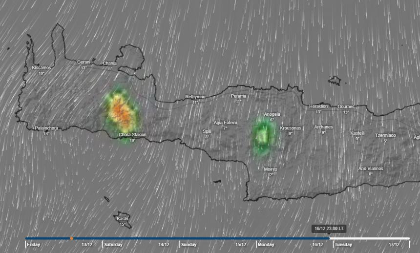 Σύμφωνα πάντως με τον ιστότοπο poseidon.hcmr.gr η χιονόπτωση στην Κρήτη αναμένεται να ξεκινήσει το απόγευμα της Δευτέρας 16/12 από τα ορεινά των Σφακίων, την νύχτα θα χιονίσει και στον Ψηλορείτη, ενώ τις πρωινές ώρες της Τρίτης 17/12 αναμένονται χιόνια και στα ορεινά του Λασιθίου και στην συνέχεια σταματούν οι χιονοπτώσεις.