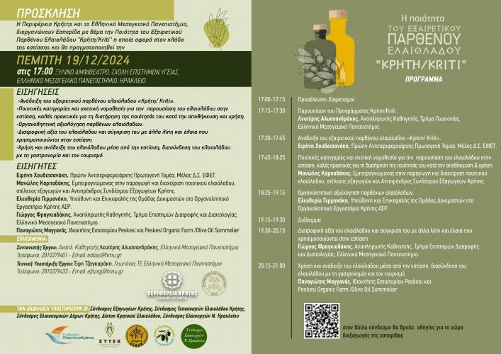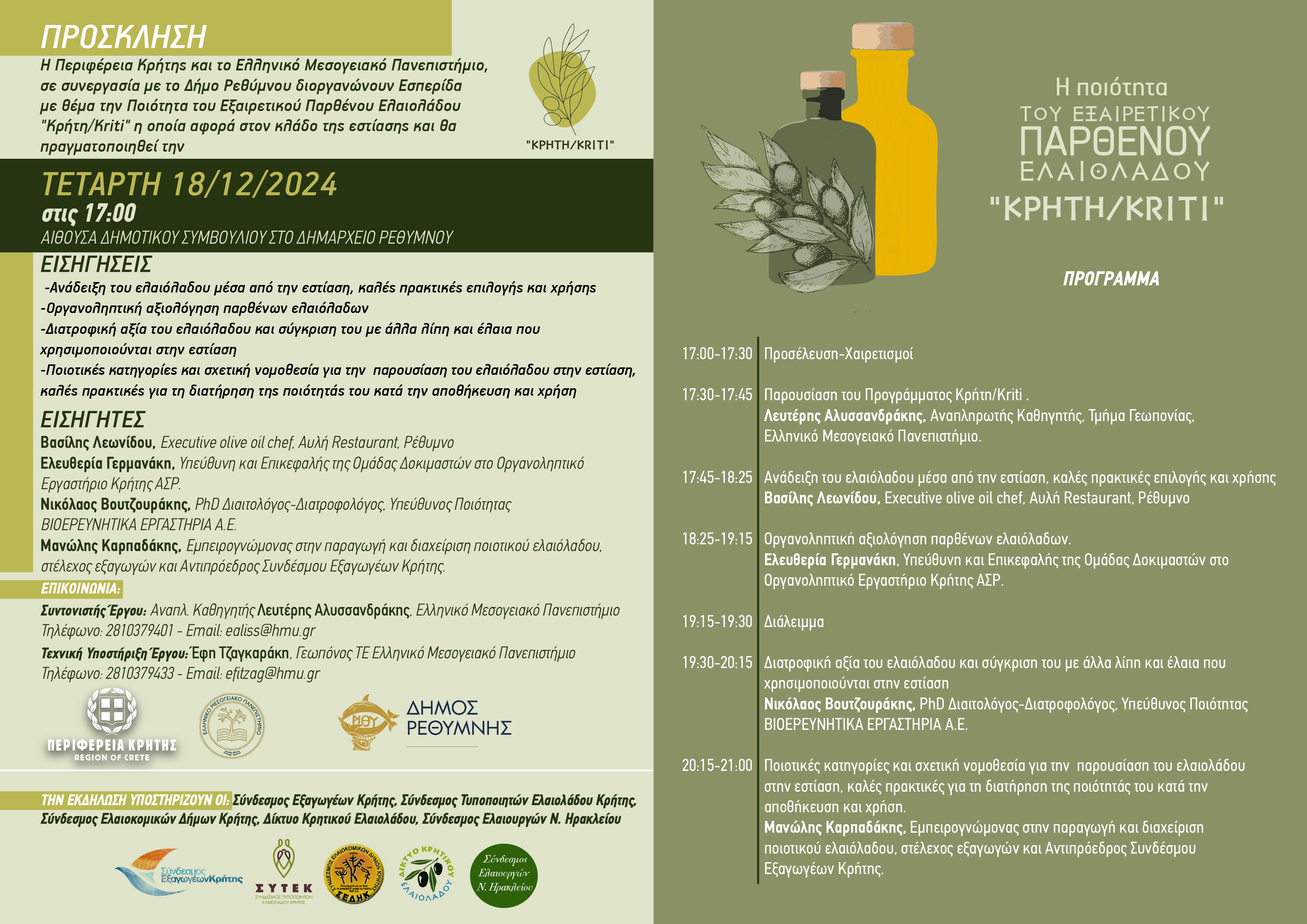 Ο Αντιπεριφερειάρχης Αγροτικής Οικονομίας Σταύρος Τζεδάκης, σε δήλωση του αναφέρει: «Συνεχίζουμε τις εκπαιδευτικές ενημερώσεις για την Ποιότητα του Εξαιρετικού Παρθένου Ελαιολάδου Κρήτη/Kriti” στην εστίαση. Στόχος των ενημερώσεων είναι να μεταδώσουν το συγκριτικό πλεονέκτημα του ελαιολάδου, την διατροφική του αξία, στα εστιατόρια, στα ξενοδοχεία, ώστε οι συνταγές τους να στηρίζονται στο Εξαιρετικό Παρθένο Ελαιόλαδο Κρήτη/Kriti”. Το Εθνικό μας προϊόν είναι σημαντικό μέρος της γαστρονομίας μας, του Κρητικού διατροφικού πολιτισμού, της Κρητικής διατροφής και οφείλουμε όλοι μαζί να το αναδείξουμε και να το προωθήσουμε».