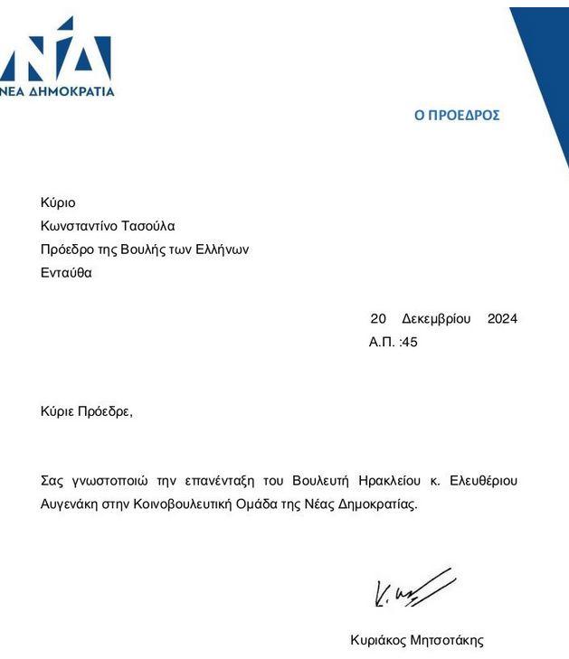 Ο πρωθυπουργός Κυριάκος Μητσοτάκης με επιστολή του στον Πρόεδρο της Βουλής Κώστα Τασούλα, του γνωστοποιεί την επανένταξη του βουλευτή Ηρακλείου Ελευθέριου Αυγενάκη στην Κοινοβουλευτική Ομάδα της Νέας Δημοκρατίας.
