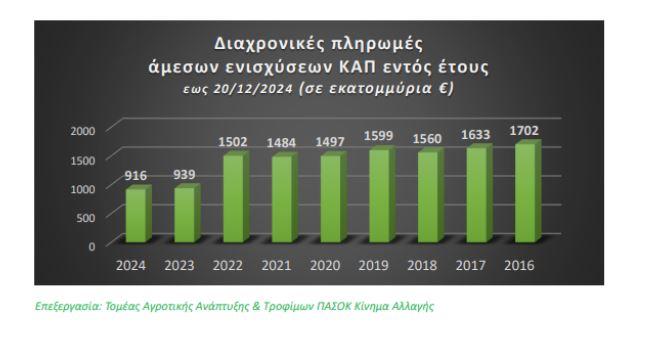 Συνολικά, 971 εκατομμύρια ευρώ δεν έχουν αποδοθεί μέχρι σήμερα στους δικαιούχους παραγωγούς για το 2024.