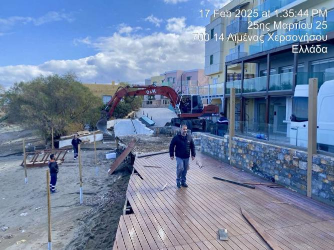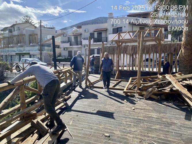 Παράλληλα, σε εξέλιξη βρίσκεται η εκτέλεση έντεκα (11) πρωτοκόλλων κατεδάφισης της Κτηματικής Υπηρεσίας, που αφορούν σε έξι θέσεις στο Δήμο Χερσονήσου. Τα πρωτόκολλα, που εκτελούνται τώρα, αφορούν στην ανατολική παράκτια ζώνη του Λιμένα Χερσονήσου και ειδικότερα, σε καταστήματα υγειονομικού ενδιαφέροντος, αυθαίρετες κατασκευές ξενοδοχείων και μεταλλικές σκάλες πρόσβασης κατά μήκος της ακτογραμμής, μια εκ των οποίων κρινόμενη ως στατικά ανεπαρκής για την ασφαλή πρόσβαση στον αιγιαλό.
