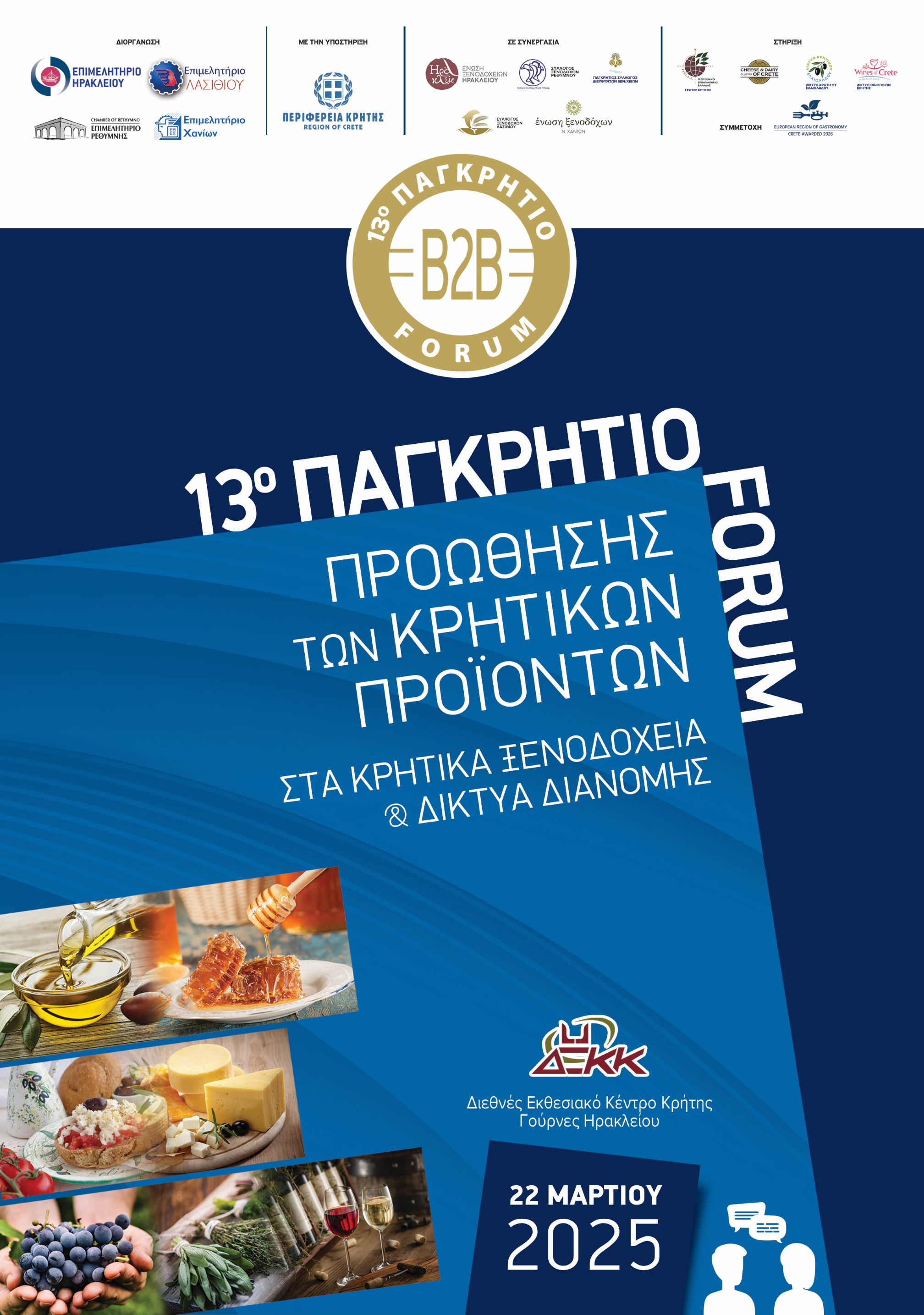 Το 13ο Παγκρήτιο Forum θα διεξαχθεί το Σάββατο 22 Μαρτίου 2025 στο ΔΙΕΘΝΕΣ ΕΚΘΕΣΙΑΚΟ ΚΕΝΤΡΟ ΚΡΗΤΗΣ (ΔΕΚΚ) στις Γούρνες Ηρακλείου με συμμετοχές απ’ όλη την Κρήτη. Θα περιλαμβάνει συναντήσεις για τη διάθεση φρέσκων και μεταποιημένων κρητικών αγροτικών προϊόντων στα κρητικά ξενοδοχεία και στην τοπική αγορά, μέσω των δικτύων διανομής – super market, καθώς και συναντήσεις με βιοτέχνες, μεταποιητές και άλλων προϊόντων που σχετίζονται με τον τουρισμό (πχ είδη συσκευασίας, καθαριστικά, εξοπλισμός κλπ), ώστε να δοθεί η ευκαιρία επέκτασης της συνεργασίας και με άλλους τομείς της τοπικής οικονομίας, πλην του αγροδιατροφικού.