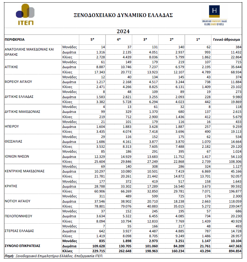 Τέλος να σημειωθεί ότι σε σύγκριση με το 2023 ο αριθμός των ξενοδοχείων της χώρας αυξήθηκε κατά 0,56% από τα 10.047 στα 10.104, ενώ ο αριθμός των κλινών κατά 0,80% στις 894.854 από 887.748 ένα χρόνο πριν.