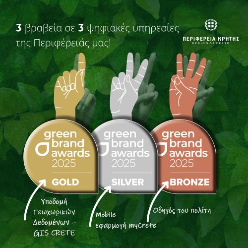 Τρία βραβεία απονεμήθηκαν στην Περιφέρεια Κρήτης σε τελετή των Green Brand Awards 2025, που πραγματοποιήθηκε από την BOUSSIAS events, την Τρίτη 11 Μαρτίου και στην οποία παραβρέθηκαν περισσότεροι από 250 εκπρόσωποι φορέων, Πανεπιστημίων και Αυτοδιοίκησης, στελέχη επιχειρήσεων και επαγγελματίες. Η τελετή αφορούσε σε βράβευση προϊόντων, υπηρεσιών, τεχνολογιών και πρακτικών που συνδυάζουν την καινοτομία με τη βιωσιμότητα και προάγουν την Πράσινη Οικονομία.