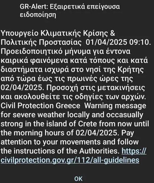 ΚΡΗΤΗ 01.04.2025 09:21Κακοκαιρία: Μήνυμα από το 112 για την Κρήτη Ρέθεμνος Newsroom Facebook Twitter Copy link 0 Την προσοχή των πολιτών, λόγω της κακοκαιρίας που πλήττει τις τελευταίες ώρες την Κρήτη, εφιστούν οι αρχές, ενώ λίγο μετά τις 9.00 το πρωί έφτασε στα κινητά μήνυμα του 112. 0 Facebook Twitter Copy link ΣΧΕΤΙΚΑ ΑΡΘΡΑ Κρήτη 12.04.2026 12:23Με οδηγό το Πάσχα ανοίγει η τουριστική σεζόν – Θετικά μηνύματα αλλά και προκλήσεις για Κρήτη, Ρόδο και Σαντορίνη Κρήτη 12.04.2026 12:04Κρήτη - μεταναστευτικό: Νέες αφίξεις στα νότια παράλια Κρήτη 11.04.2026 22:38Σταύρος Αρναουτάκης: «Το Άγιο Φως μεταφέρει το μήνυμα της ελπίδας και της Ανάστασης σε ολόκληρη την Κρήτη» Κρήτη 11.04.2026 18:46 Κρήτη: Αναβαθμίζεται και αδειοδοτείται το δημοτικό ελικοδρόμιο της Γαύδου