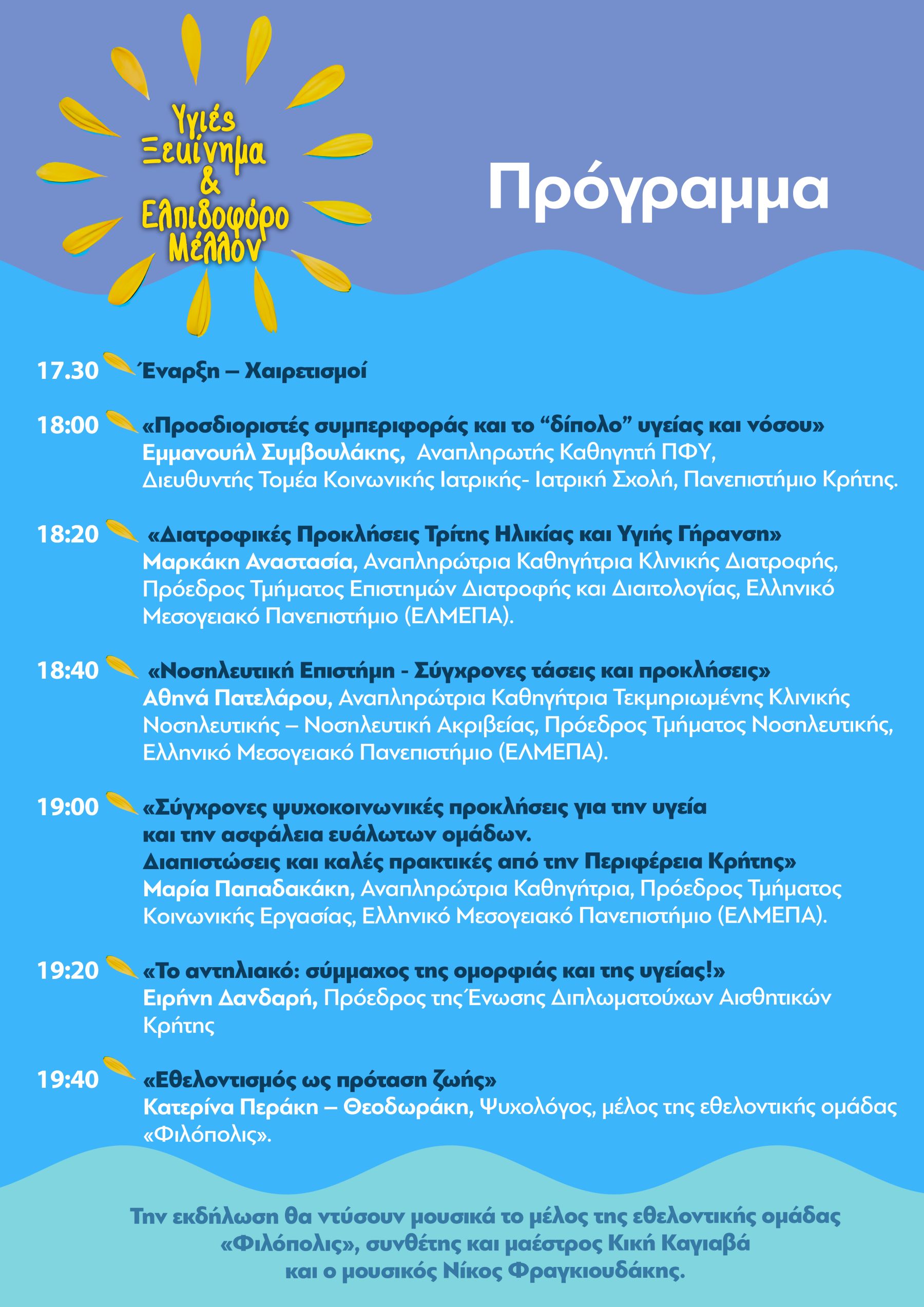 19:00. «Σύγχρονες ψυχοκοινωνικές προκλήσεις για την υγεία και την ασφάλεια ευάλωτων ομάδων. Διαπιστώσεις και καλές πρακτικές από την Περιφέρεια Κρήτης»