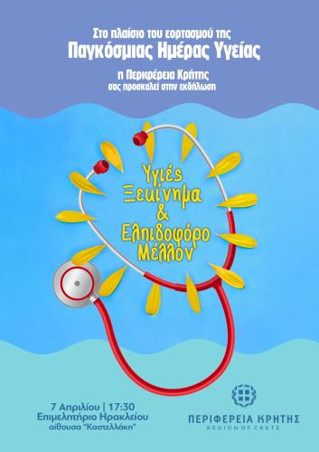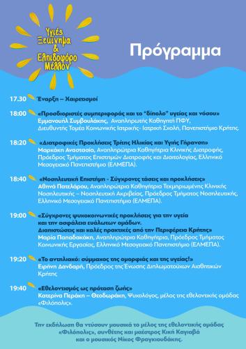 Το απόγευμα της ίδιας μέρας θα πραγματοποιηθεί ημερίδα με τίτλο «Υγιές ξεκίνημα και ελπιδοφόρο μέλλον» , στο Επιμελητήριο Ηρακλείου στην αίθουσα «Καστελλάκη» με ώρα έναρξης στις 17:30.