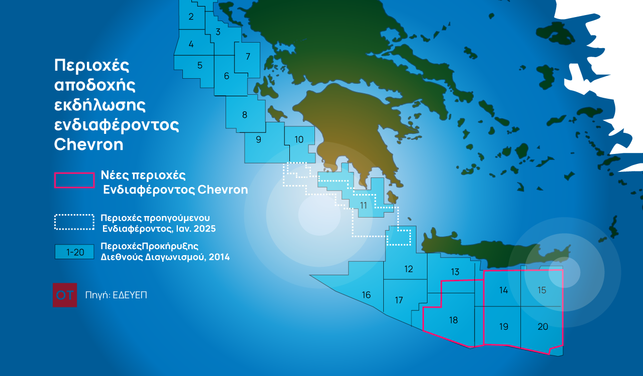 Υπενθυμίζεται ότι ο αμερικανικός πολυεθνικός κολοσσός στο upstream έχει εκδηλώσει ενδιαφέρον για τις θαλάσσιες παραχωρήσεις: «Νότια της Πελοποννήσου», «Νότια της Κρήτης Ι» και «Νότια της Κρήτης ΙΙ». Η HELLENiQ ENERGY έχει εκδηλώσει ενδιαφέρον για το «Α2», το οποίο γειτνιάζει με το «Νότια της Πελοποννήσου».